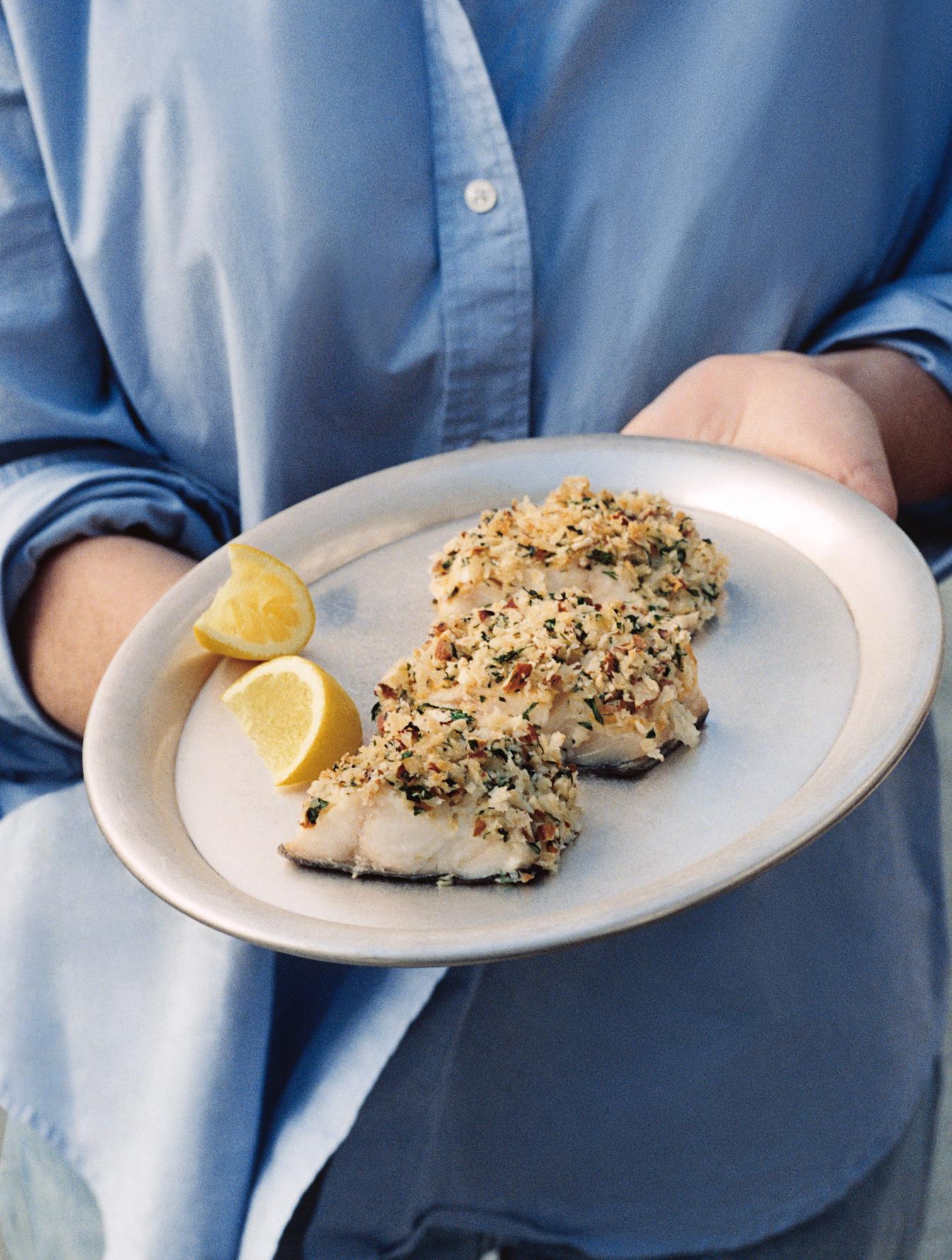 Press almond–herb mixture firmly onto mustard-brushed side of cod fillets.
