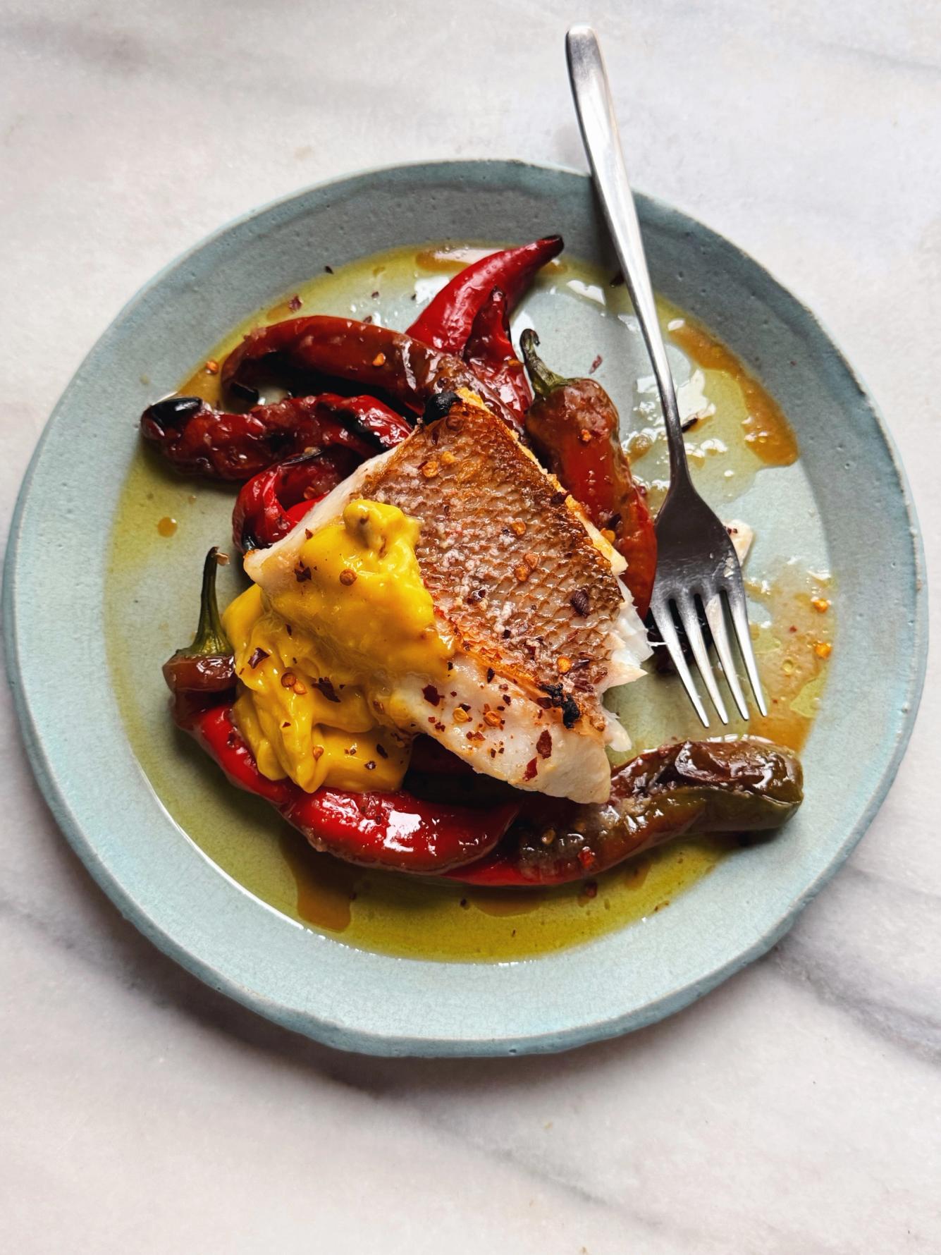 Let us not forget the almighty broiler! A power tool in your arsenal, so long as you keep a keen eye and stay focused. Here, we’re leaning on the broiler to quickly cook a couple beautiful filets of Seremoni Grade Vermilion Rockfish and also to blister some sweet peppers. This recipe calls for Jimmy Nardellos, an Italian heirloom pepper known for their rich sweetness. They are perfectly unfussy, as they can pleasantly be eaten whole - skin, seeds, and all. If you can’t get your hands on them, you can use a regular red bell pepper in their place–-they’ll need to cook a bit longer, and depending on your sensitivity to pepper skins stuck between your teeth, you might also want to peel them off before proceeding with marinating. The dish is pulled together with a gratuitous dollop of homemade olive-oil-rich aioli. If you’re short on time, you can make a cheat’s version by microplaning some garlic into store bought mayo, so long as you promise you’ll find the time next time…