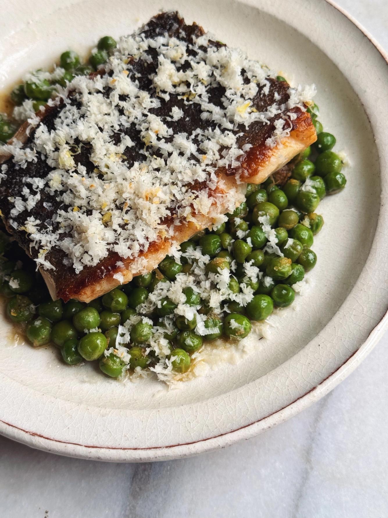 To serve, spoon the lemony peas onto a plate. Spoon any residual brown butter over the peas. Place the cod, crispy skin-side up, on top of the peas. Finish with a pinch of flaky salt, then generously shower everything in freshly grated horseradish.